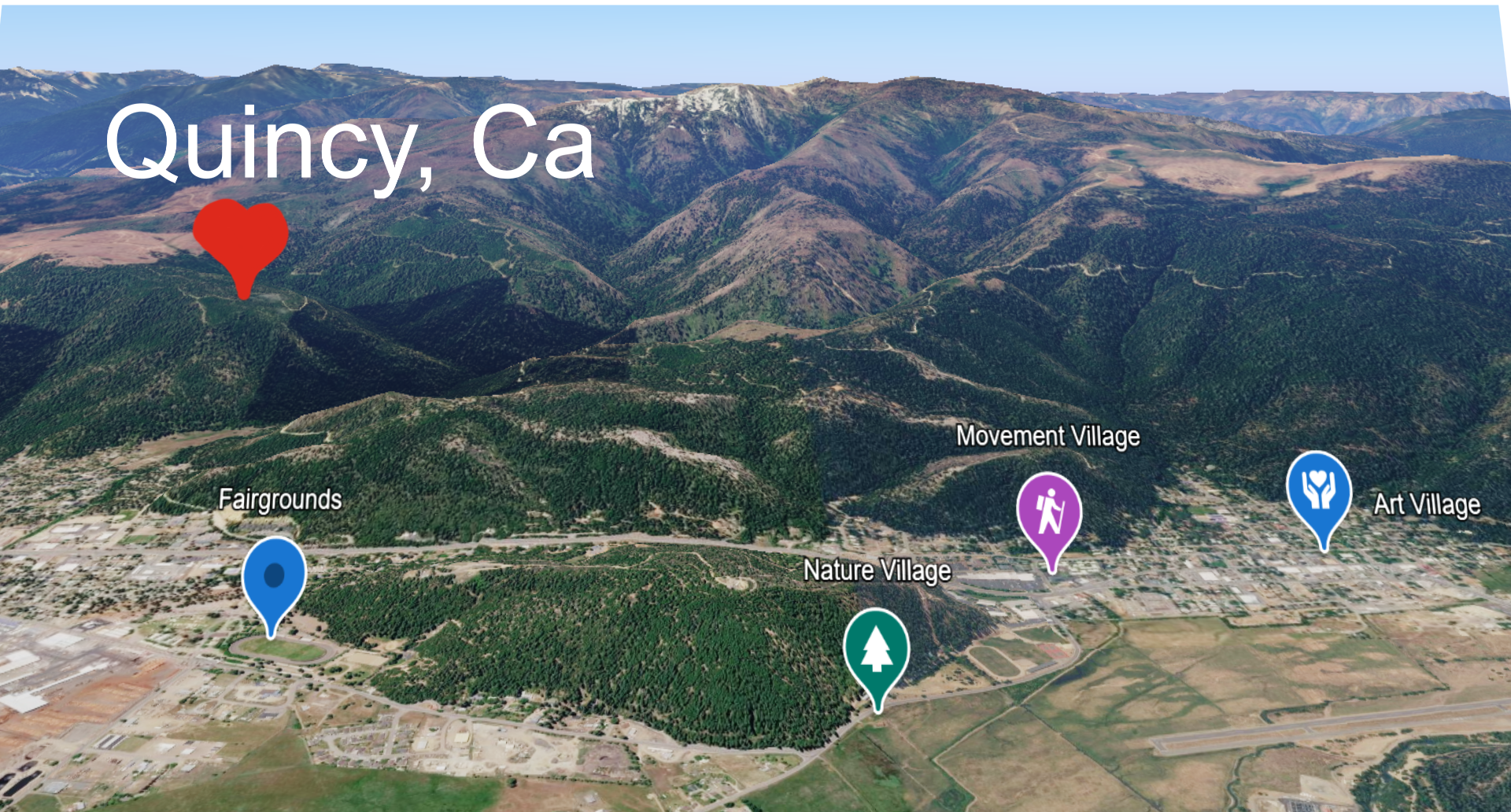 A community-wide gathering for wellbeing, creativity, movement, time in nature, and connection—anchored at the fairgrounds and spread across Quincy California by bike.